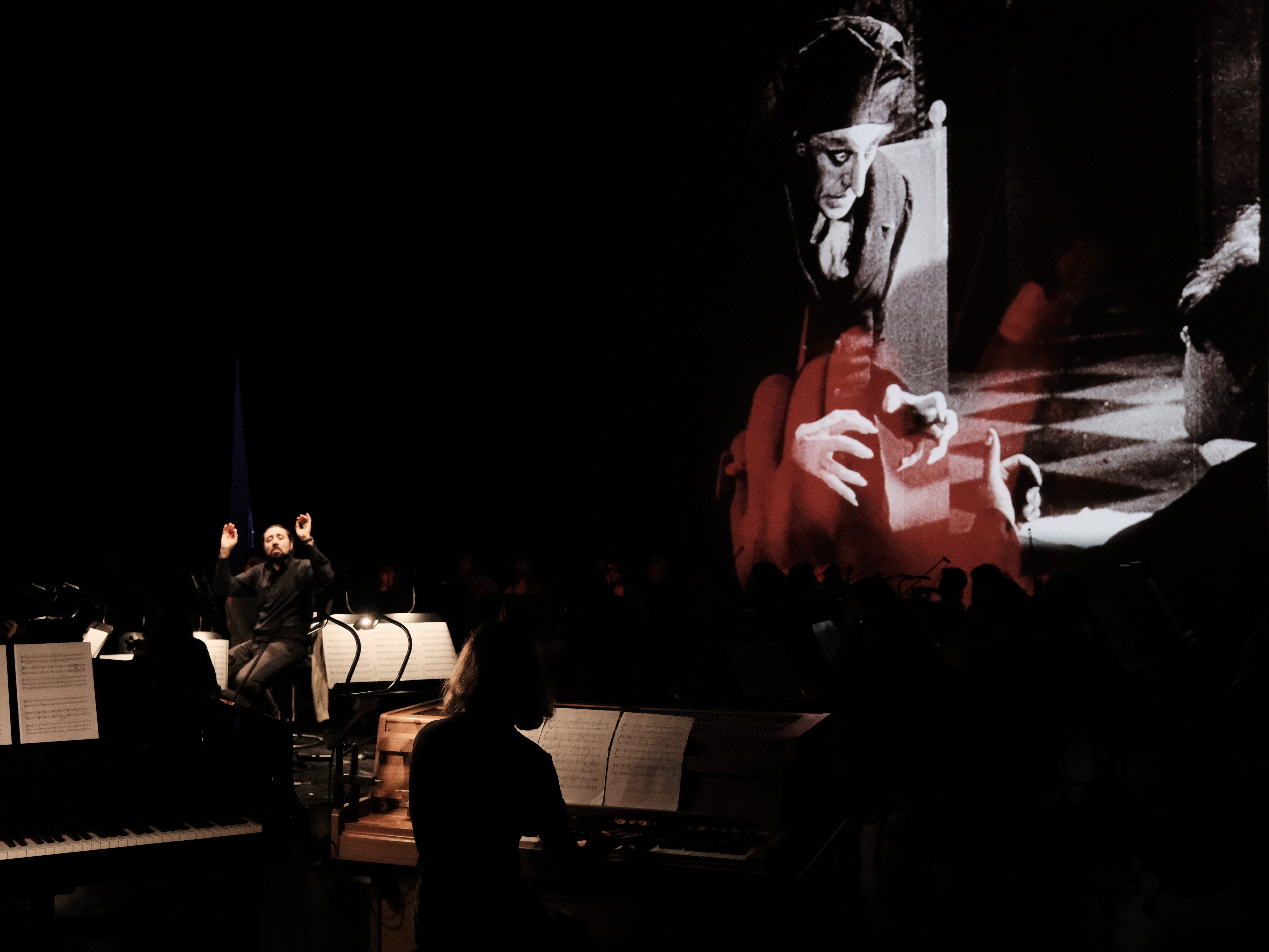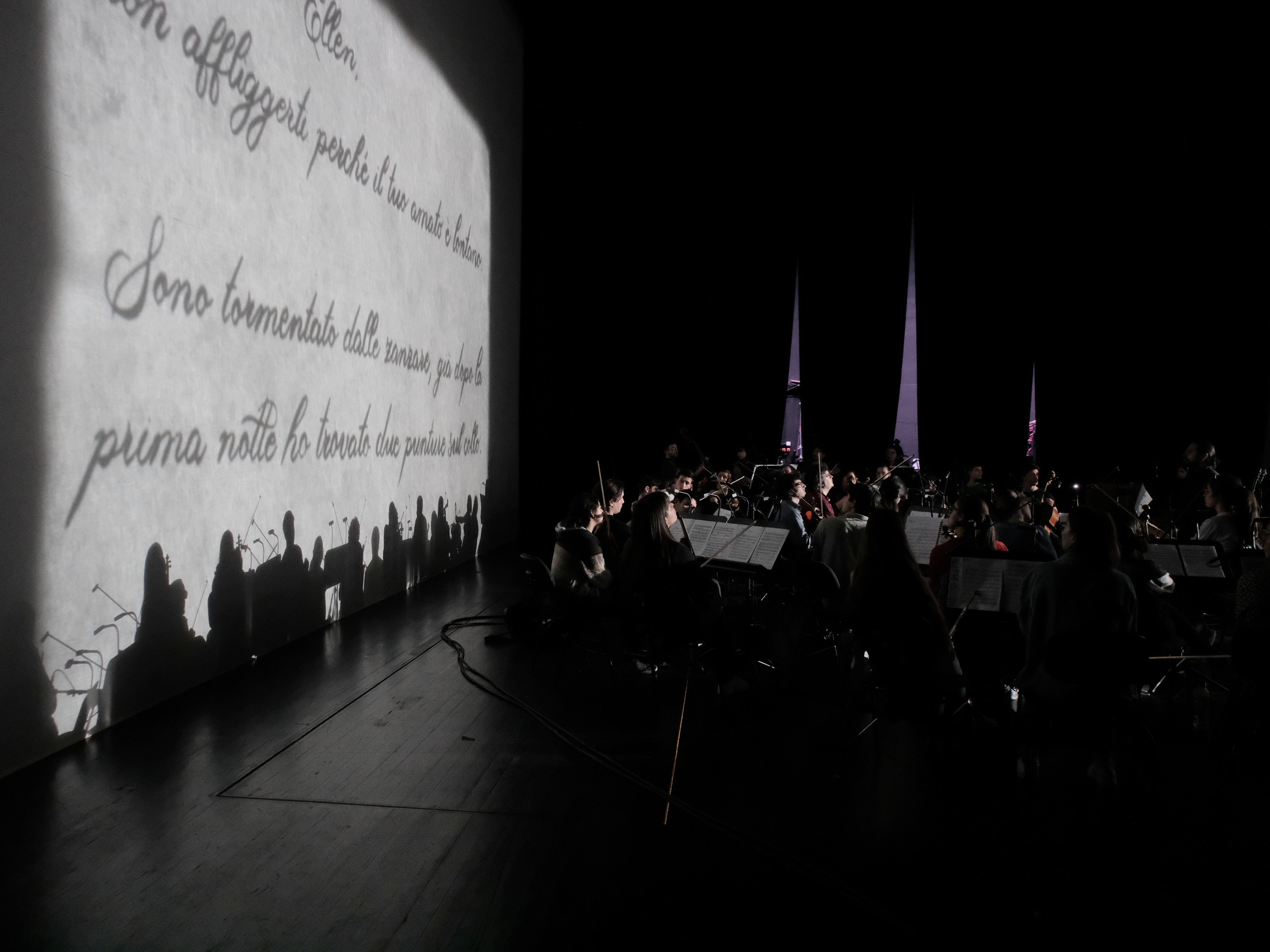 Sinfonia dell’orrore, capovolge e sovverte la pratica di mettere la musica al servizio delle immagini, ponendo come punto di partenza la scelta del repertorio musicale. Si accostano le sonorità di due autori apparentemente agli antipodi, Alban Berg e Morton Feldman. Il primo fu il più poetico e forse tormentato tra gli autori dell’espressionismo viennese. I suoi tre pezzi estratti dalla Lyrische Suite sono un concentrato di espressività inquieta e profonda passione. La musica di Morton Feldman al contrario è fatta di poche note distillate. Ogni singolo piccolo gesto strumentale diventa profondamente espressivo: il suono di un vibrafono sembra il rintocco di una campana, la nota lunga di una viola il canto di una voce lontana, un frammento melodico asimmetrico di una tromba il suono di una litania misteriosa. Assieme alla musica di questi due autori, nel mezzo del viaggio musicale, Ramifications di György Ligeti crea una sorta di intermezzo onirico con il timbro denso del suo mare sonoro. Una multiproiezione in cui il film rimontato diviene “materia viva” per un’opera del tutto nuova e originale. Sulla scena un’orchestra d’archi ed un piccolo ensemble strumentale, una di fronte all’altro. Nel mezzo il direttore d’orchestra.